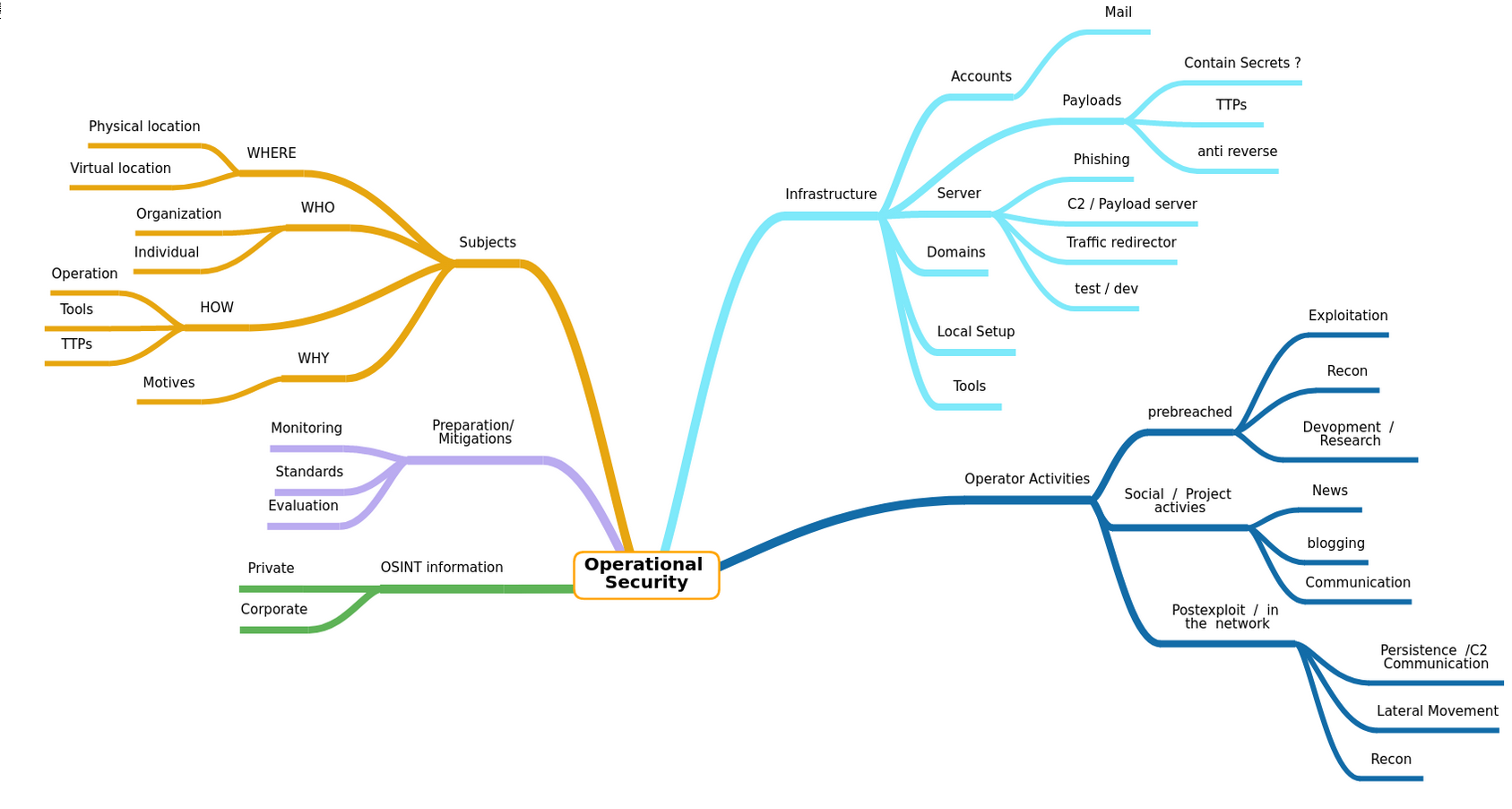 One of the mean aspects of opsec is the sheer scale of things to be aware of. The following diagram is by no means holistic nor based on academic papers, but represents one strategy to categorize the topics.