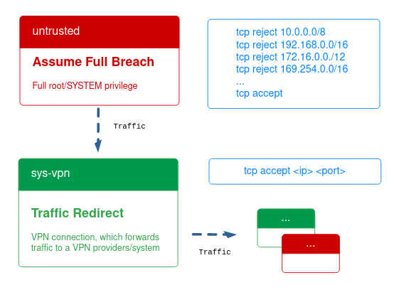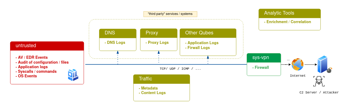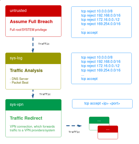 Let’s assume a full compromise of a working qube. Traffic is forwarded to a network vm, which tunnels everything.